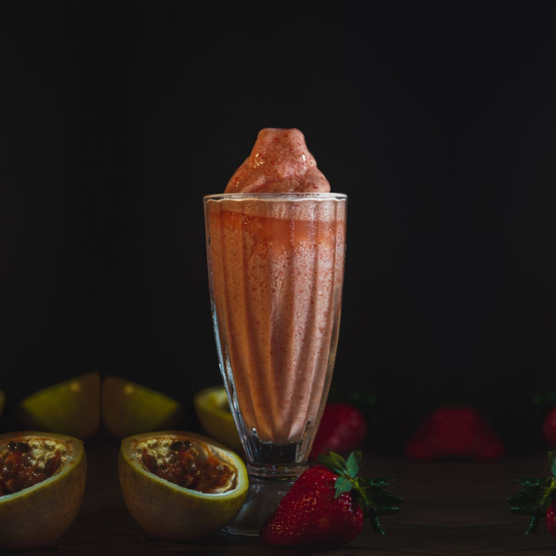 Combinacion perfecta de fresas selectas ,combinada en un iceberg con maracuyas seleccionadas